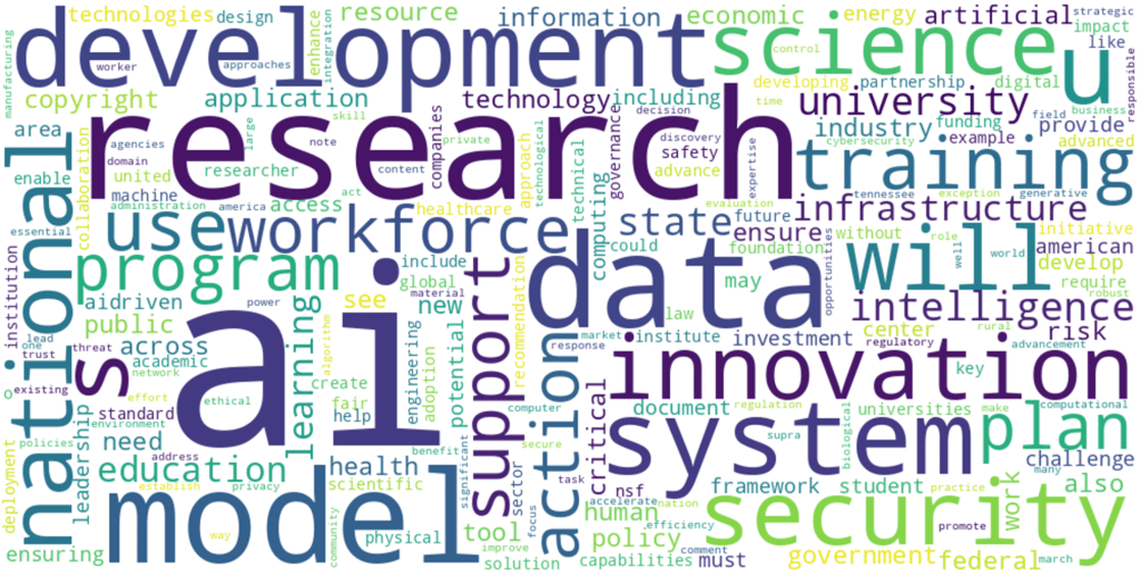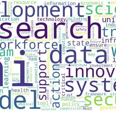 A few notable findings stood out from the academic institution feedback. The topic of copyright is nearly as prominent as the terms “university” and “education,” suggesting an high value placed on this issue academic circles. AI infrastructure, technology, and models are discussed not just as technical issues, but as societal foundations. Almost all of the responses propose concrete actions—collectively, the group of academic institutions is unusually “solution-forward” when contrasted with other RFI respondent pools. And finally, there is a repeated call not simply for one-time and static regulation relating to AI, but for flexible and adaptive federal policy.