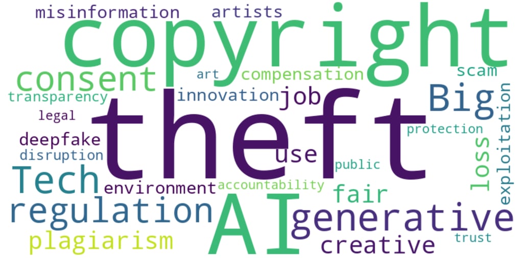 Big Tech Distrust (~30-35% of responses): There was a strong sentiment of distrust toward large AI companies, with accusations of exploitation and disregard for public interests. The term "Big Tech" was often used to describe companies like OpenAI and others involved in generative AI.