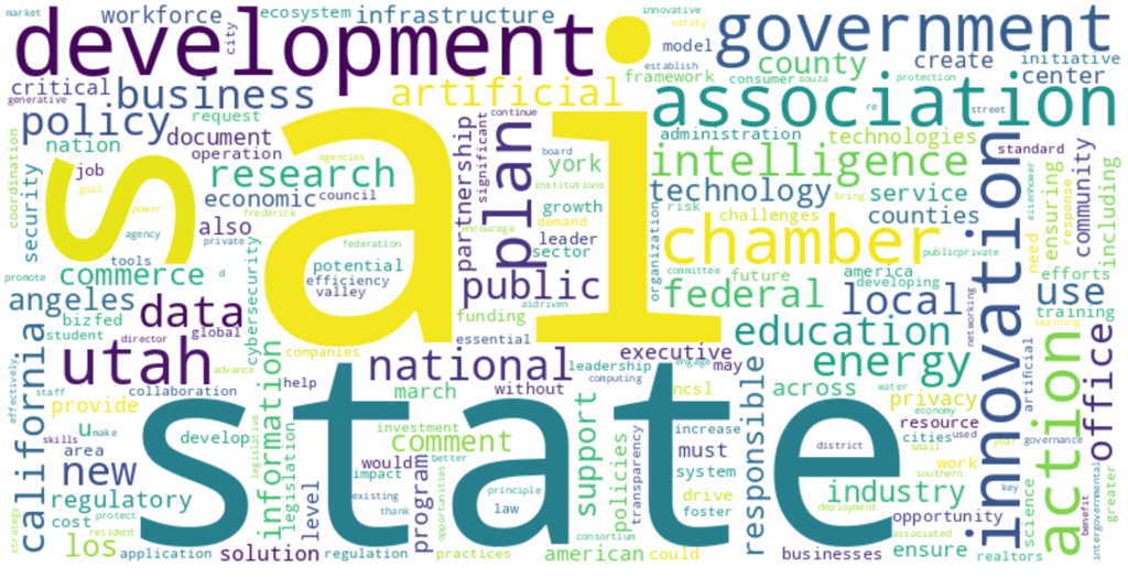 State and local government organization responses to the federal AI Action Plan RFI reveal strong optimism and a forward-looking approach to AI’s potential. Respondents are focused on harnessing AI to promote regional economic growth, modernize government services, and strengthen education and workforce development. A sense of urgency and practical orientation runs throughout, with repeated calls for collaborative planning, actionable policies, and equitable access to AI’s benefits for all communities.
